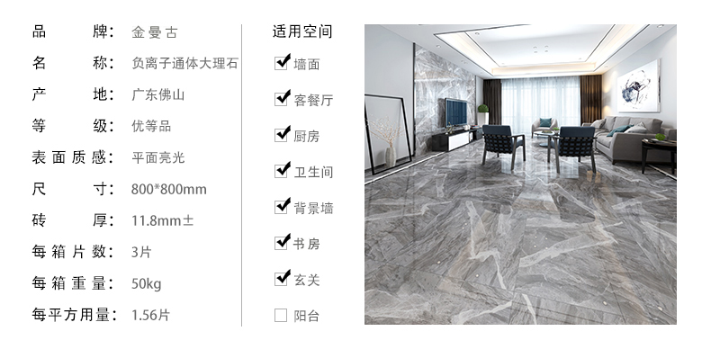 金曼古負(fù)離子瓷磚,能持續(xù)產(chǎn)生負(fù)離子,提高居室內(nèi)空氣負(fù)離子濃度,改善室內(nèi)空氣質(zhì)量,提升人體健康水平。負(fù)離子被稱為空氣維生素,負(fù)離子瓷磚創(chuàng)造安全健康的空間環(huán)境。工程用磚全拋釉地磚、通體大理石瓷磚、金剛石地磚等支持加工定做家裝瓷磚批發(fā)。