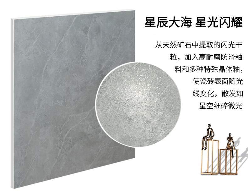 星光釉 【產品介紹】從天然礦石中提取的閃光干粒,加入高耐磨防滑釉料和多種特殊晶體釉,使瓷磚表面隨光線變化,散發如星空細碎微光。星光釉系列經過30000噸超大壓機無摸壓制成型,胚體受力更均勻,具有更高平整度、超強抗沖擊、韌性與硬度。