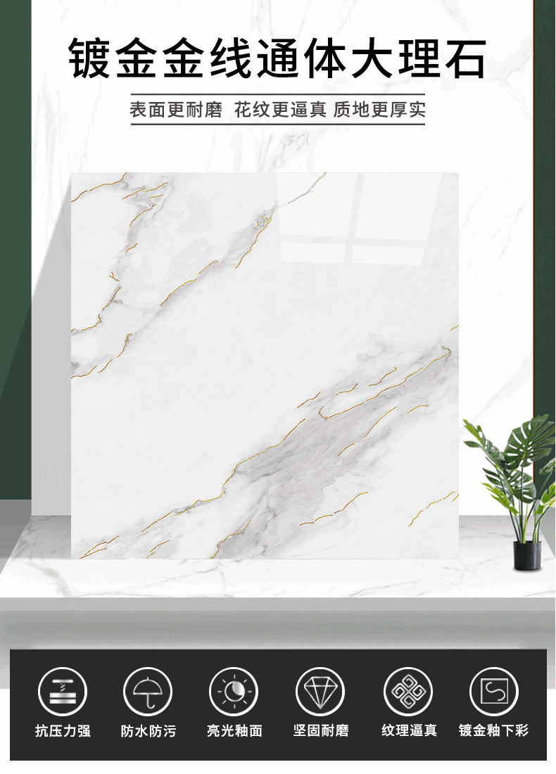 金線金粉 【產(chǎn)品介紹】航天級(jí)激光鍍金工藝,鉆石雕刻技術(shù),高溫慢燒,釉層不吸污吸水率低,真空鍍金燒成后再進(jìn)行真空電鍍工藝,平整如鏡面,精拋細(xì)磨,磚面平整光滑細(xì)膩光澤度、亮度、硬度較高。立體紋理,釉下彩工藝,三次淋釉增加磚面的立體感。