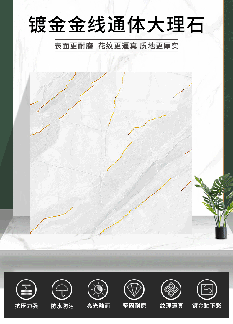金線金粉 【產品介紹】航天級激光鍍金工藝,鉆石雕刻技術,高溫慢燒,釉層不吸污吸水率低,真空鍍金燒成后再進行真空電鍍工藝,平整如鏡面,精拋細磨,磚面平整光滑細膩光澤度、亮度、硬度較高。立體紋理,釉下彩工藝,三次淋釉增加磚面的立體感。