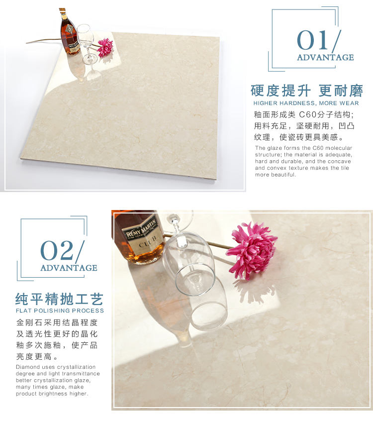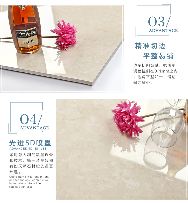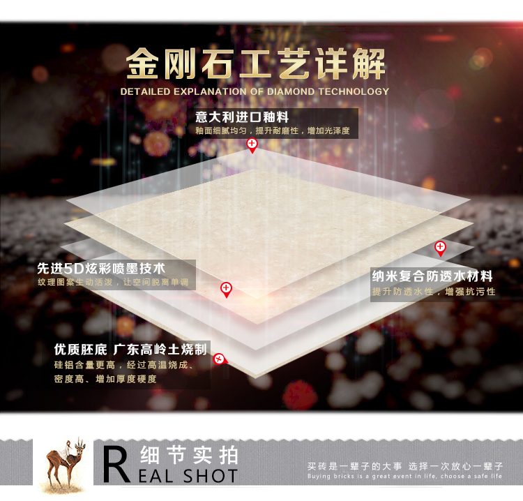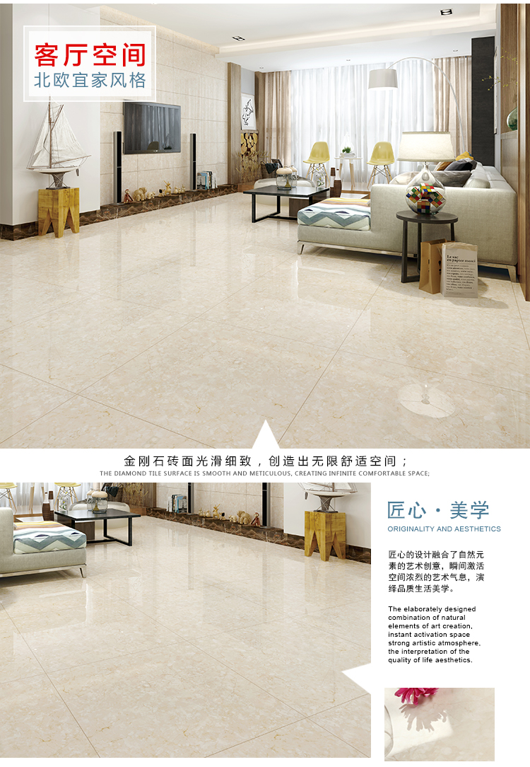 金曼古瓷磚廠家特價金剛石因高品質(zhì)而得名,是一款極具天然石材效果和微晶石質(zhì)感的仿石材瓷磚,它不但在價格、環(huán)保、耐用和清潔上極具優(yōu)勢,在質(zhì)感、規(guī)格、花色、重量等指標(biāo)上,金剛石都遠(yuǎn)遠(yuǎn)勝于石材、拋光磚。相比其他種類的產(chǎn)品,它最大的特點(diǎn)可以用“高亮度、高耐磨、高平整、高逼真、高清晰、高環(huán)保”。