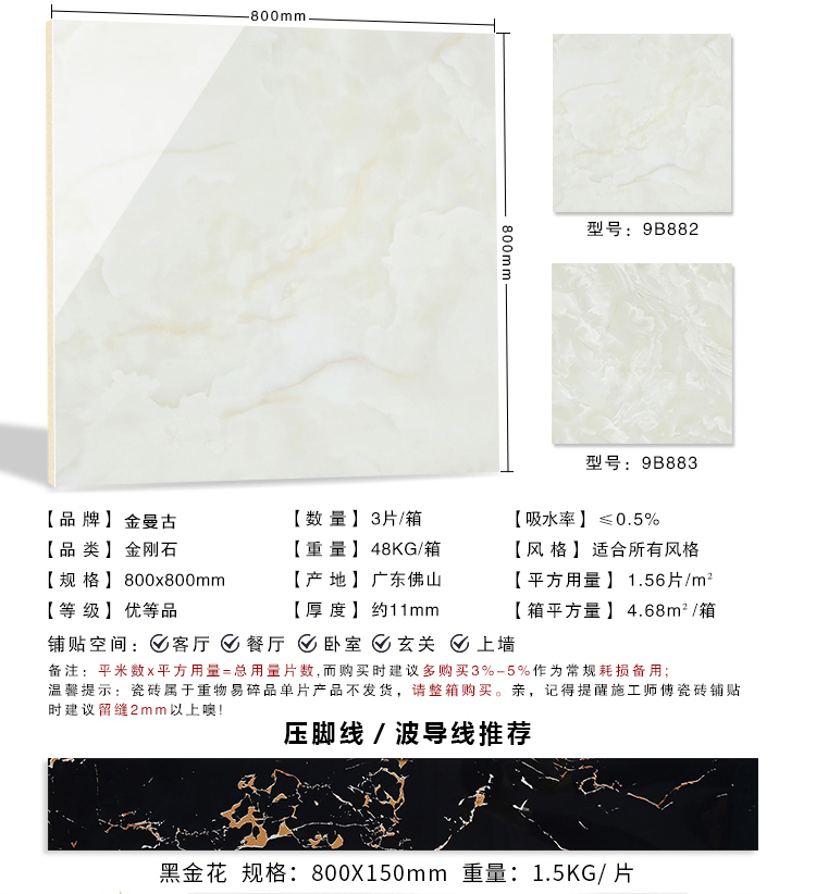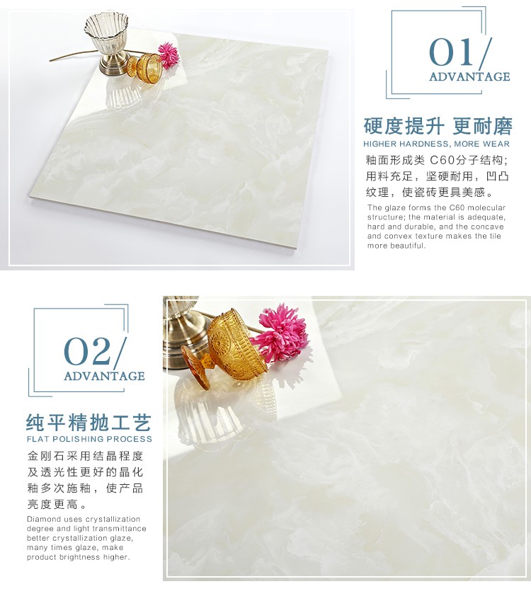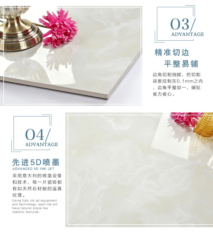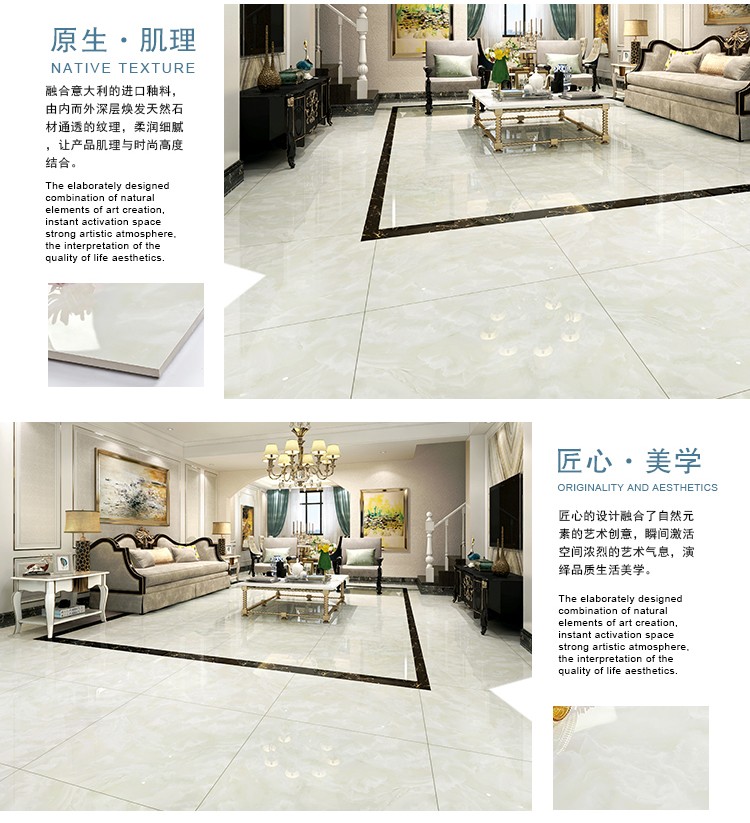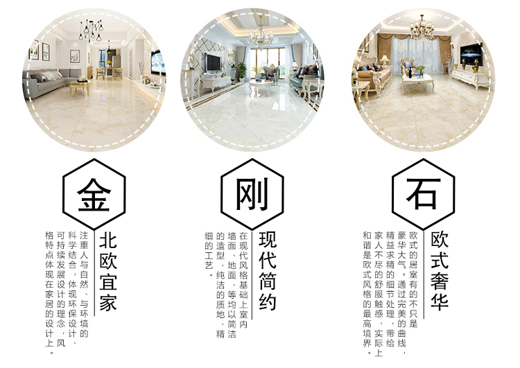 金曼古全拋釉瓷磚運用多層特殊制造工藝,將全透析釉料下彩技術結(jié)合先進印刷工藝,令花紋俯在下層,低碳能源、清潔生產(chǎn),表面光潔剔透,獨有釉料精拋工序,集拋光磚與仿古磚優(yōu)點于一體,釉面如拋光磚般光滑亮潔,同時其釉面花色如仿古磚般圖案豐富,色彩厚重或絢麗。
