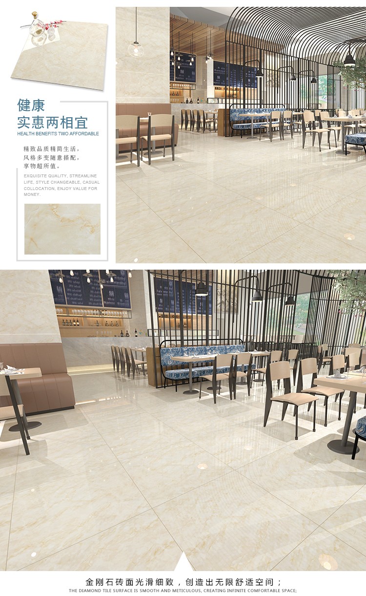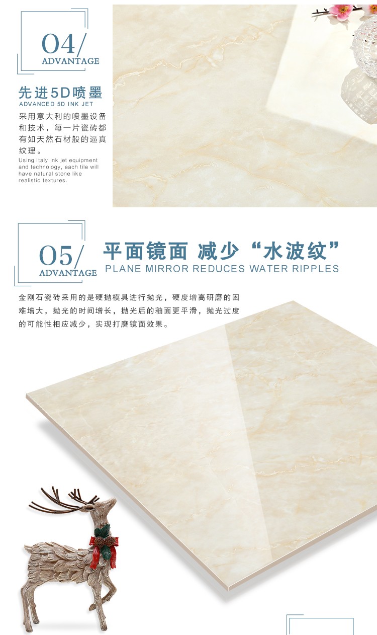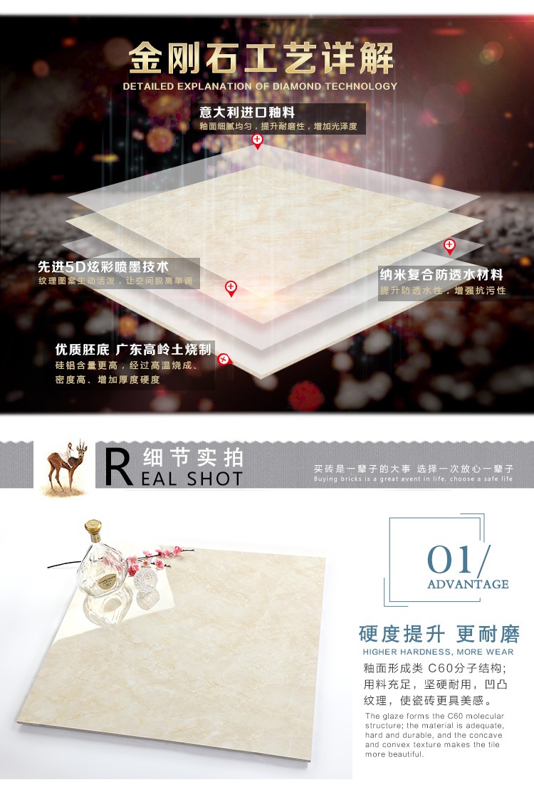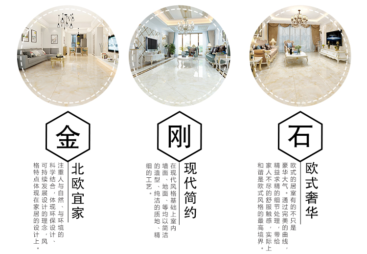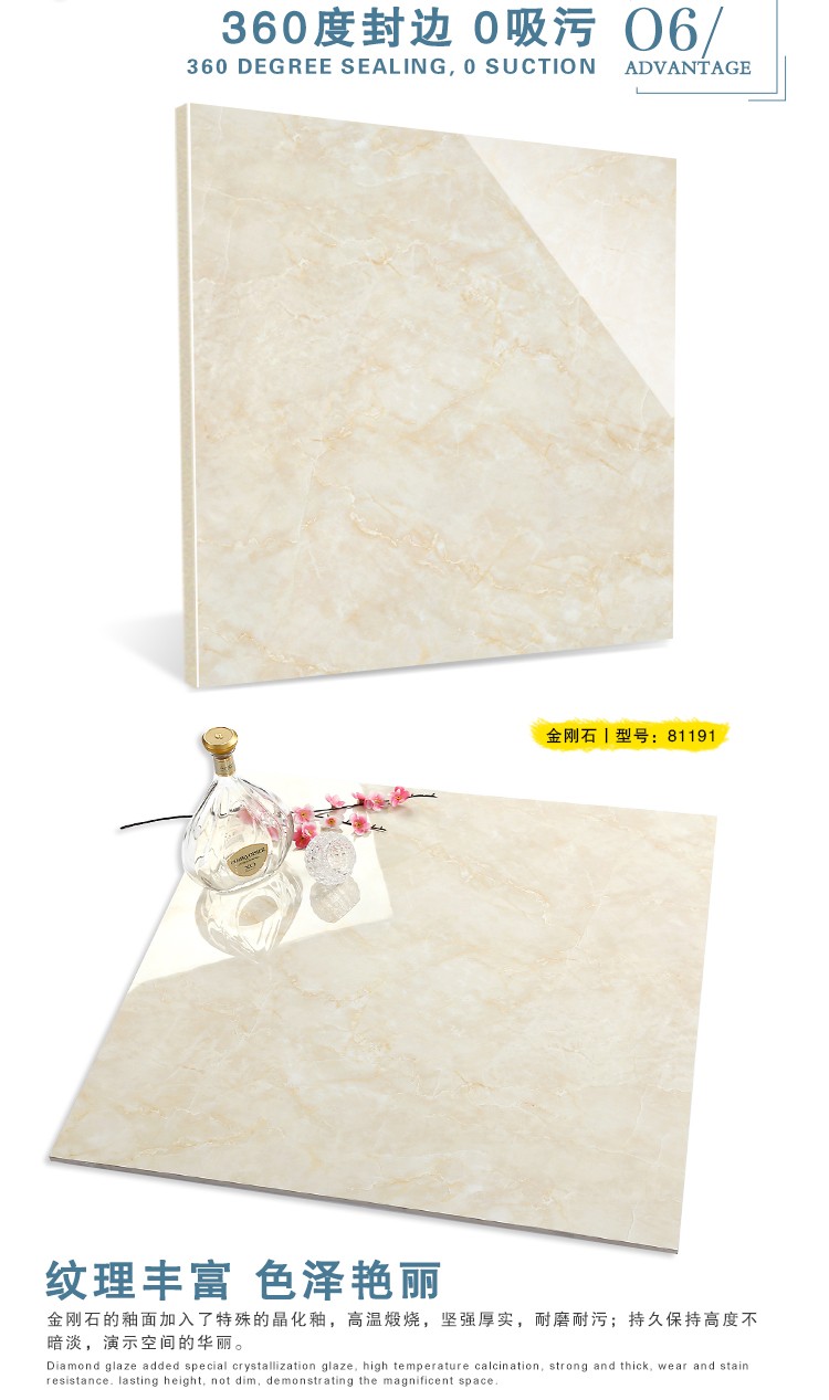 金曼古全拋釉瓷磚運用多層特殊制造工藝,將全透析釉料下彩技術結合先進印刷工藝,令花紋俯在下層,低碳能源、清潔生產,表面光潔剔透,獨有釉料精拋工序,集拋光磚與仿古磚優點于一體,釉面如拋光磚般光滑亮潔,同時其釉面花色如仿古磚般圖案豐富,色彩厚重或絢麗。