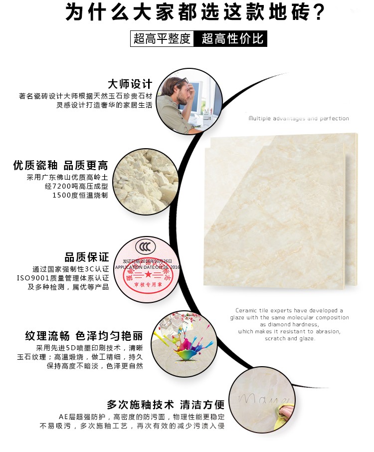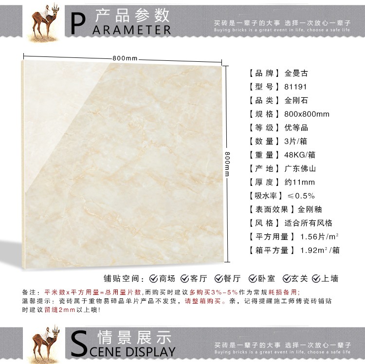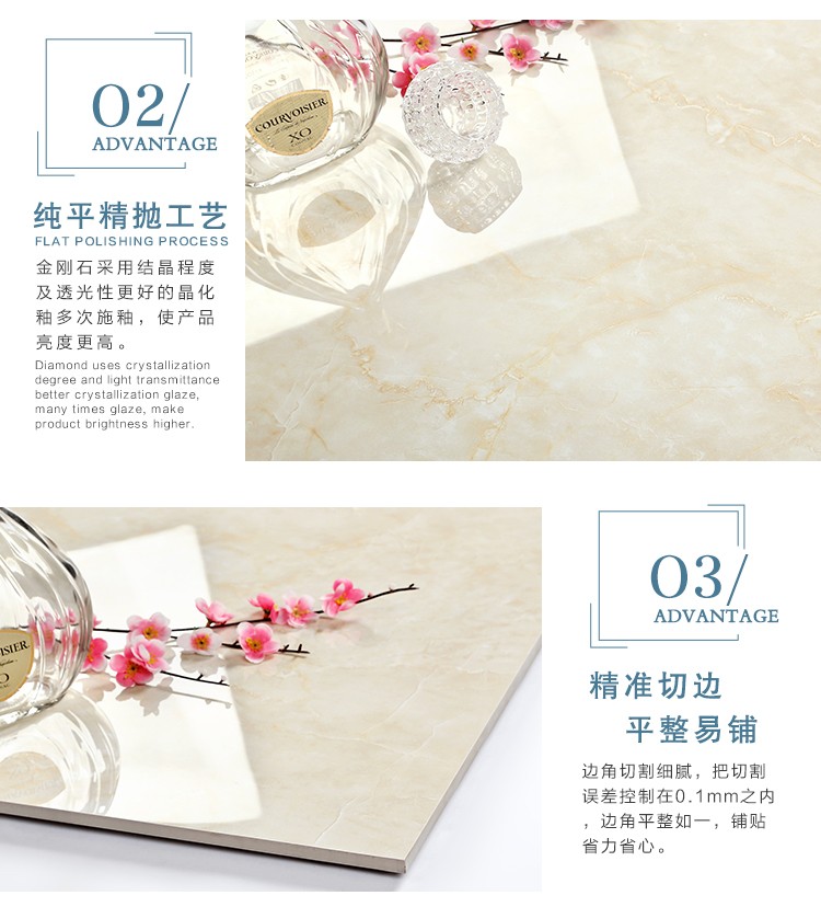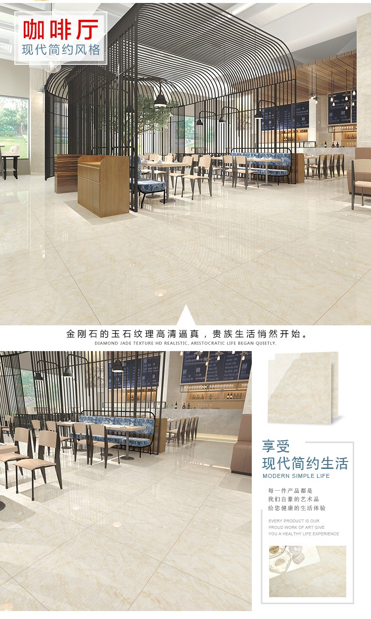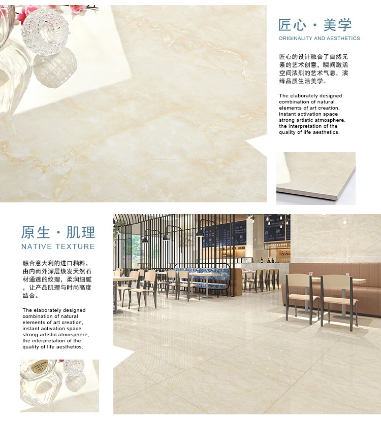 金曼古全拋釉瓷磚運用多層特殊制造工藝,將全透析釉料下彩技術結合先進印刷工藝,令花紋俯在下層,低碳能源、清潔生產,表面光潔剔透,獨有釉料精拋工序,集拋光磚與仿古磚優點于一體,釉面如拋光磚般光滑亮潔,同時其釉面花色如仿古磚般圖案豐富,色彩厚重或絢麗。