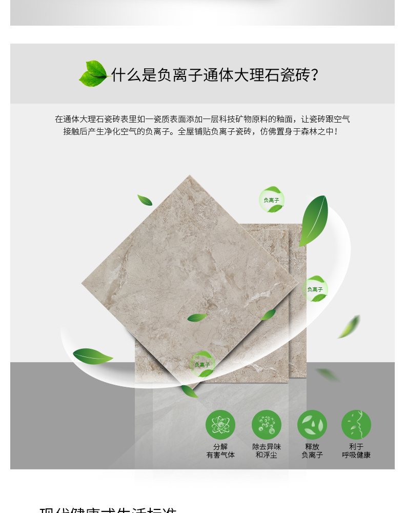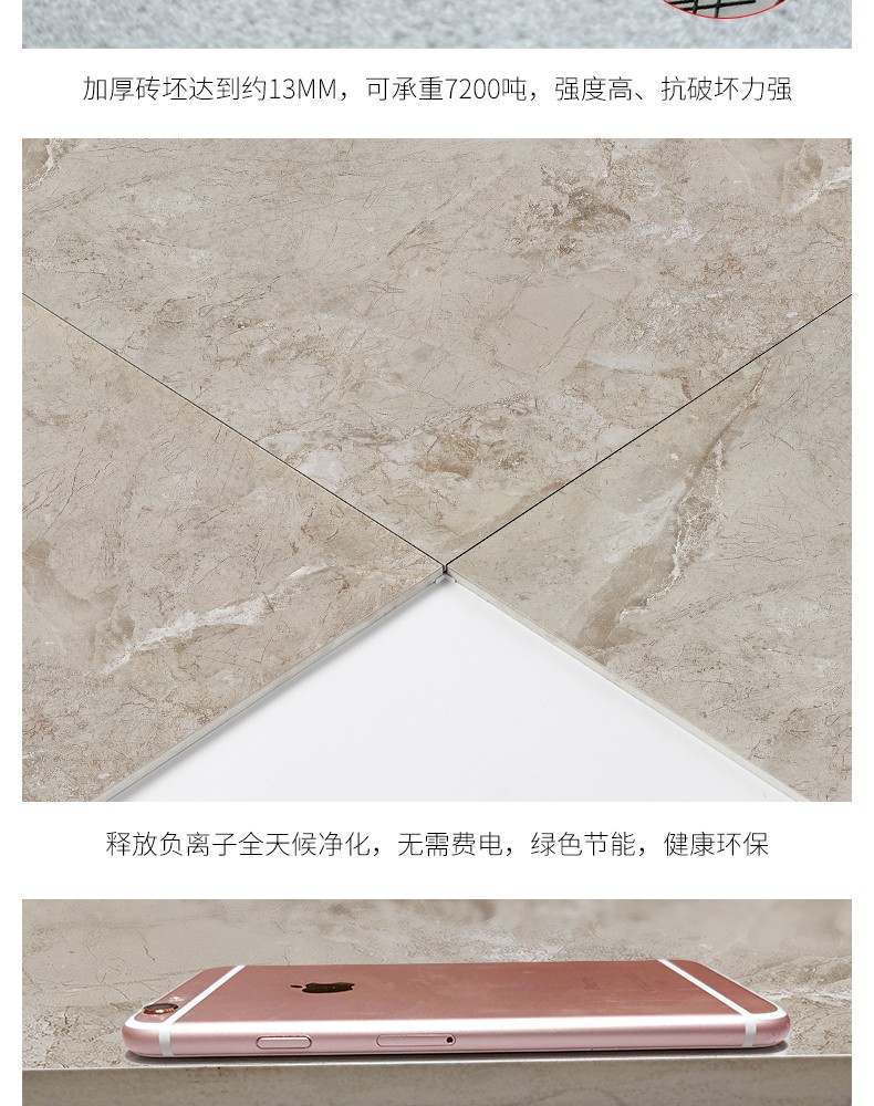 金曼古負離子瓷磚,能持續產生負離子,提高居室內空氣負離子濃度,改善室內空氣質量,提升人體健康水平。負離子被稱為空氣維生素,負離子瓷磚創造安全健康的空間環境。工程用磚全拋釉地磚、通體大理石瓷磚、金剛石地磚等支持加工定做家裝瓷磚批發。